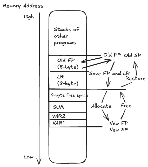 STR W6, [FP, #SUM] // Store sum at 0x0FF8Save LR and previous program’s FP with the first 16-byte: